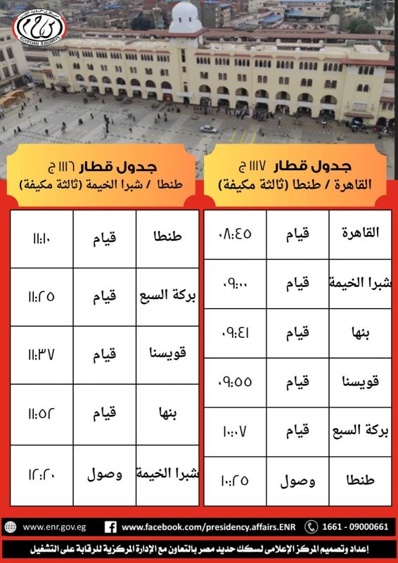 * القطار رقم (1117) بعربات درجة ثالثة مكيفة، يقوم من محطة القاهرة الساعة 8:45 صباحا ويصل إلى محطة طنطا الساعة 10:25 صباحا طبقا للجدول المرفق ولا يعمل أيام الجمع والعطلات .