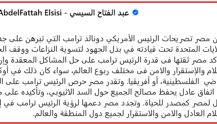 وأضاف الرئيس السيسى، عبر حسابه الرسمي بمواقع التواصل الاجتماعى “فيس بوك”، أن مصر تؤكد ثقتها فى قدرة الرئيس ترامب على حل المشاكل المعقدة وإرساء السلام والإستقرار والامن فى مختلف ربوع العالم، سواء كان ذلك في أوكرانيا، أو الأراضي الفلسطينية، أو أفريقيا.