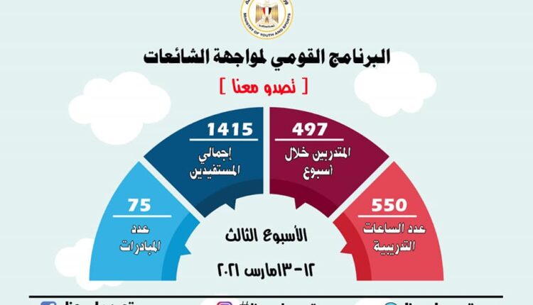 أطلقت وزارة الشباب والرياضة، برئاسة الدكتور أشرف صبحي ،فعاليات المرحلة الأولي من البرنامج القومي لمواجهة الشائعات تحت شعار “تصدوا معنا” في 11محافظة (القاهرة،الاسكندرية،الغربية،الشرقية ،المنيا ،سوهاج،اسيوط،الودي الجديد ،بورسعيد، السويس، مطروح” بمشاركة 70مدرباً خريجي البرنامج القومي لمواجهة الشائعات الذي أطلقته الوزارة فبراير 2020 لإعداد مدربي مواجهة الشائعات .