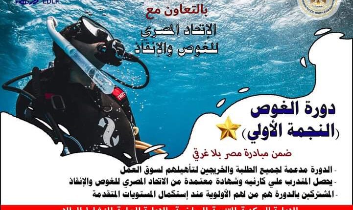تنظم وزارة الشباب والرياضة من خلال الإدارة المركزية للتنمية الرياضية – الإدارة العامة للنشاط الرياضي الطلابي، بالتعاون مع الإتحاد المصري للغوص والانقاذ عددًا من دورات الغوص (النجمه الاولي) المدعمة للطلبة والخريجين، وذلك ضمن مبادرة “مصر بلاغرقي”.