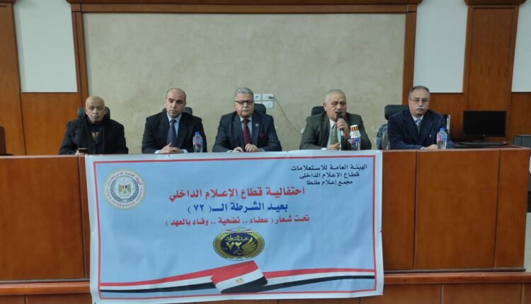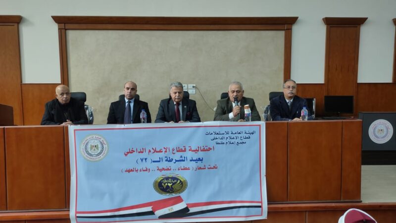 انطلاقا من الدور الهام الذي تقوم به الهيئه العامة للاستعلامات برئاسة الدكتور ضياء رشوان في تنظيم المؤتمرات والندوات الكبرى التي تبرز أهم المناسبات الوطنية والقومية وتزامناً مع احتفالات الدولة المصرية ووزارة الداخلية بالعيد الثاني والسبعين للشرطة المصرية نظم المجمع الاعلامي بطنطا التابع لقطاع الاعلام الداخلي اليوم الأربعاء ندوه موسعة تحت عنوان (( الشرطة المصرية عطاء تضحية وفاء بالعهد )) وذلك بقاعة المؤتمرات بالمجمع الإعلامي بطنطا حاضر فيها اللواء سعيد طعيمه مساعد وزير الداخلية الأسبق ورئيس لجنة النقل والمواصلات بمجلس النواب سابقاً والدكتور عبد المنعم شهاب وكيل لجنة الصحة بمجلس النواب والكاتب الصحفي الكبير ناصر ابو طاحون نقيب الصحفيين بالغربية واعدها وادارها الإعلامي ابراهيم عبد النبي والإعلامي السيد سنيد وبمشاركة الاستاذ ضاحي هجرس مدير المركز الإعلامي بطنطا
