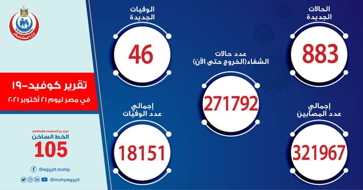 وأوضح الدكتور خالد مجاهد مساعد وزيرة الصحة والسكان للتوعية والتواصل المجتمعي والمتحدث الرسمي للوزارة، أنه تم تسجيل 883 حالة جديدة ثبتت إيجابية تحاليلها معمليًا للفيروس، وذلك ضمن إجراءات الترصد والتقصي والفحوصات اللازمة التي تُجريها الوزارة وفقًا لإرشادات منظمة الصحة العالمية، لافتًا إلى وفاة 46 حالة جديدة.