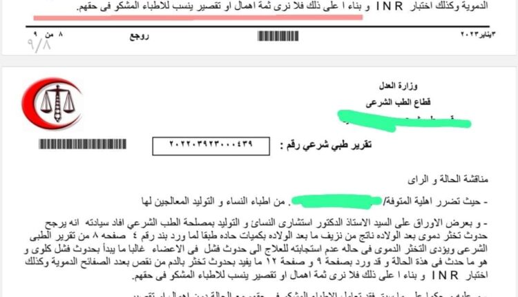 وأكد تقرير الطب الشرعي رقم 2022-3923000439 بيانه، أنه تم عرض أوراق الحالة على الدكتور استشاري النساء والتوليد بمصلحة الطب الشرعي،