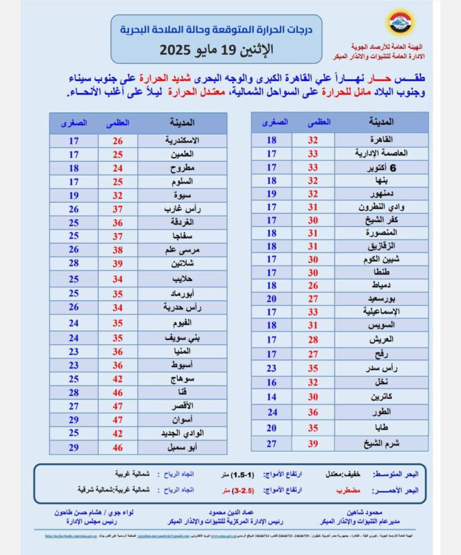 تتوقع الهيئة العامة للأرصاد الجوية، أن يشهد اليوم الإثنين 19 مايو 2025، طقس حار نهاراً على القاهرة الكبرى والوجه البحرى، شديد الحرارة على جنوب سيناء وجنوب البلاد، مائل للحرارة على السواحل الشمالية ، معتدل الحرارة ليلاً على أغلب الأنحاء .