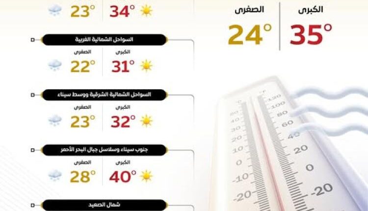 القاهرة: العظمى 35 درجة مئوية، الصغرى 25 درجة مئوية.