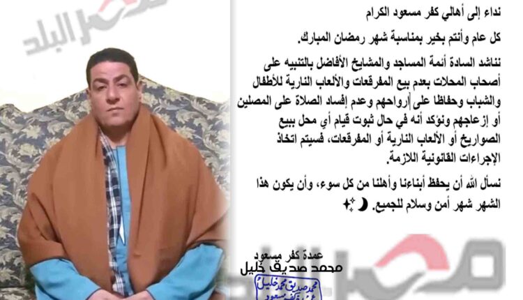 جاء ذلك في إصدار محمد صديق محمد خليل عمدة القرية منشورًا وتوزيعه على جميع المحلات والمساجد بالتنبيه المشدد والتحذير على أصحاب المحلات بالقرية بعدم بيع الصواريخ والمفرقعات والالعاب النارية للأطفال والشباب وذلك حفاظا على الأطفال وعدم ازعاج الأهالي وكبار السن والمرضي