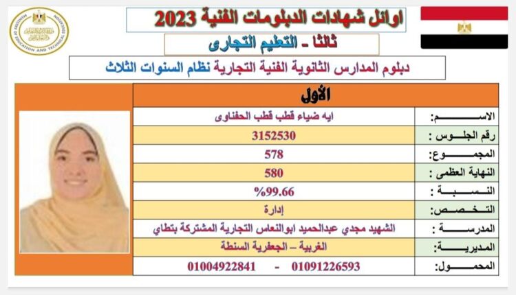 وحصلت الطالبة ايه ضياء قطب الحفناوي الطالبة بمدرسة الشهيد مجدي عبد الحميد أبو النعاس التجارية المشتركة بقرية تطاي مركز السنطة، على المركز الأول على مستوى الجمهورية في التعليم التجاري بنسبة ٩٩.٦%.