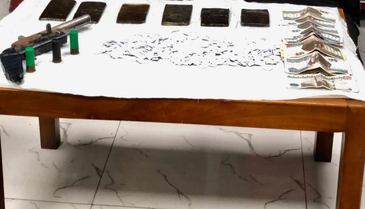 عدد 6 فرش حشيش ونصف اسطوانه هيروين وفرد خرطوش محلى الصنع وعدد 3 طلقات خرطوش وتليفون محمول ومبلع مالى 1000 جنيه