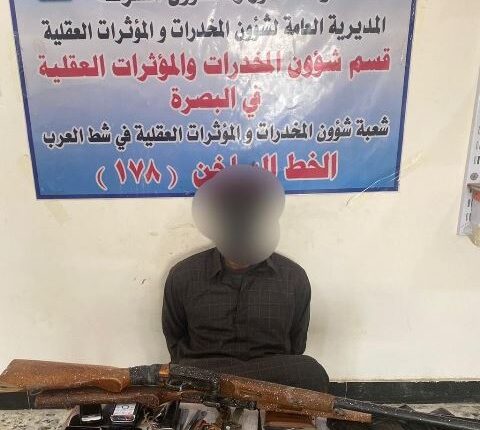 تمكنت مفارز مديرية مكافحة مخدرات البصرة بعد مقاطعة المعلومات ومطاردة تجار ومروجي ومتعاطي المخدرات في المحافظة من إلقاء القبض على متهم وضبط بحوزته (450) غراماً من مادة الترياك المخدرة وأسلحة نارية وآلات جارحة وعتاد بندقية وشريط حبوب مخدرة من المؤثرات العقلية.