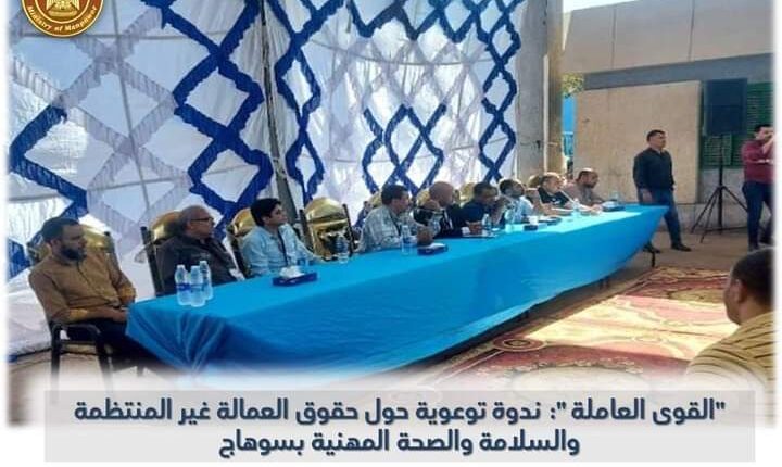 تلقت وزارة القوى العاملة تقريرا من مديرية القوى العاملة بمحافظة سوهاج بشأن عقد ندوة توعوية بمصنع بوتاجاسكو بالمحافظة حول حقوق العمالة غير المنتظمة من حيث التشغيل والرعاية الصحية والاجتماعية وتأمين العمال في محل عملهم من حيث السلامة والصحة المهنية.