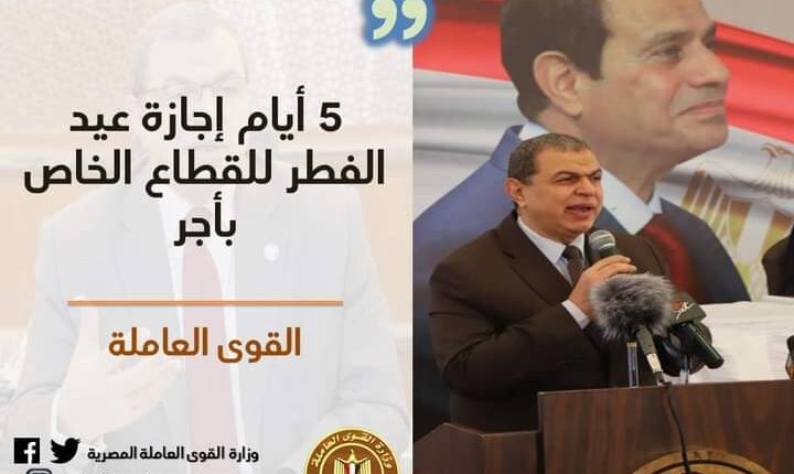 أعلنت وزارة القوي العاملة منح العاملين بالقطاع الخاص إجازة رسمية مدفوعة الأجر مدتها 5 أيام بمناسبة الاحتفال بعيد الفطر المبارك، وذلك اعتبارا من الأربعاء 12 وحتى الأحد 16 مايو الجاري.