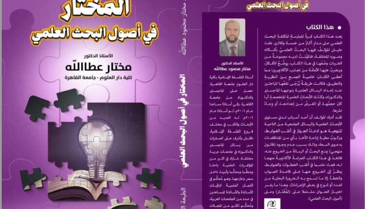 وكتاب (المختار في أصول البحث العلمي)، لفضيلة أ.د/ مختار محمود عطا الله الأستاذ بكلية دار العلوم جامعة القاهرة، هو عصارة فكر وخبرة وتجارب أستاذ قدير حوالي ثلاثين عاما من الممارسة والاطلاع والإشراف والتحكيم، وقد ضمنت هذا الخبرات الواعية بأسلوب رشيق وماتع؛ لتكون مرجعا مهما جدا ومفيدا للباحثين في مجالات: الدراسات الإسلامية، والعلوم العربية، والدراسات الإنسانية، والاجتماعية، وما يتفرد به هذا الكتاب عن غيره من كتب منهجيات البحث العلمي، أنه يشرح للباحثين والدارسين بشكل علمي وعملي ميسر ودقيق أصول البحث العلمي، وضوابطه، وخطواته، وأدواته، وأشكاله المختلفة، ليصل بهم في النهاية إلى مرمي الهدف؛ بحيث يصبح كل واحد منهم هدَّافا ليس في شِباك الكرة؛ بل في شِباك العلم والمعرفة والبحث العلمي المزهر، المثمر، المنتج، النافع للإنسان والأوطان.