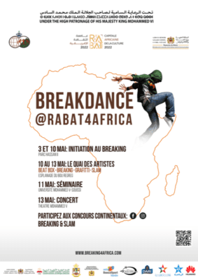 تحت الرعاية السامية للملك محمد السادس، وفي إطار الاحتفاء بمدينة الرباط عاصمة للثقافة الأفريقية لسنة 2022، وبشراكة مع وزارة الشباب والثقافة والتواصل، ووزارة التربية الوطنية والتعليم الأولي والرياضة، تحتضن عاصمة المملكة احتفاليات Breakdance@Rabat for AFRICA التي تنظمها الجامعة الملكية المغربية للرياضات الوثيرية، الرشاقة البدنية، الهيب هوب والأساليب المماثلة خلال الفترة ما بين الــ 03 و13 ماي المقبل.