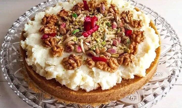 نجيب صينية وندهنها سمنة ونصب فيها الخليط ونزينها بالقشطة والفستق واللوز وعين للجمل ونقدمها