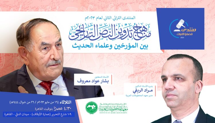 يُقيم المعهد منتداه التراثي الثاني لعام 2023م، وذلك عصرَ يوم الثلاثاء المقبل الموافق 16 مايو الجاري ، تحت عنوان: ” مناهج تدوين النص التاريخي بين المؤرخين وعلماء الحديث ” .