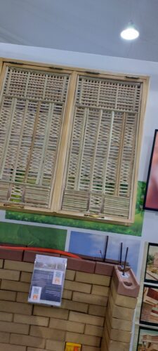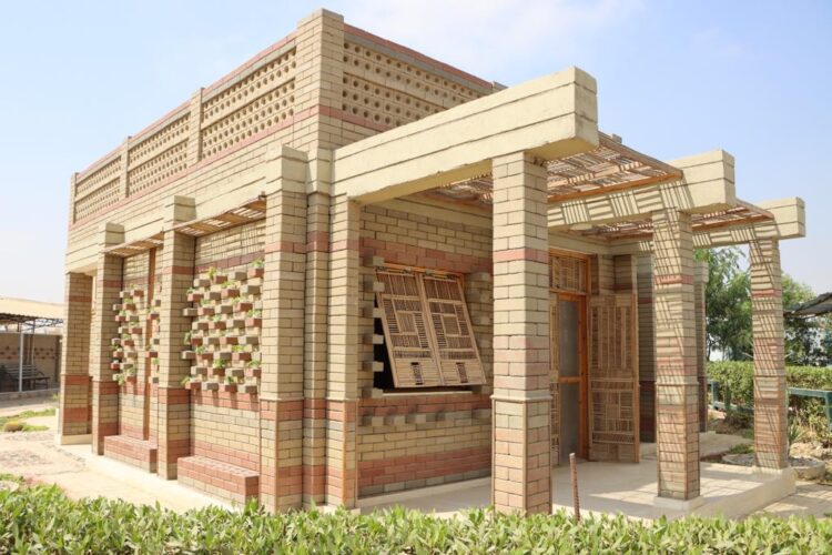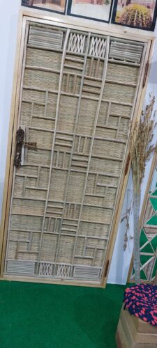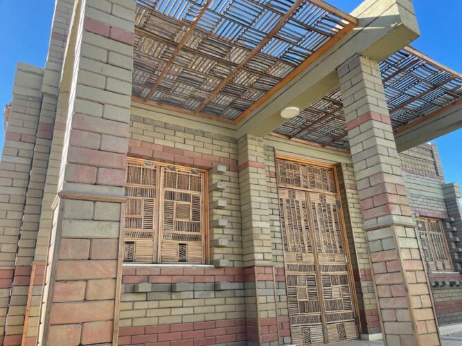 وقمنا بااستخدام الجريد بديلا للخشب فى صناعة الابواب والشبابيك لااحياء حرفة الجريد التى اوشكت على الاندثار بسبب انتشار البلاستيك واقتصرت على صناعة الكراسى وصناديق الفراخ واستغلال مخلفات تقليم النخيل فى اشكال اخرى قمنا بتنفيذ ابواب على شكل حصيرة من الجريد وشبابيك مثل المشربية ويتكون المبنى بهذه المواصفات طبقا للكود المصرى دورين بلا اعمدة خرسانية وعند بناء مبنى خمس ادوار لابد من اعمدة خرسانية و يمكن استخدام الطوب صديق البيئة فقط.