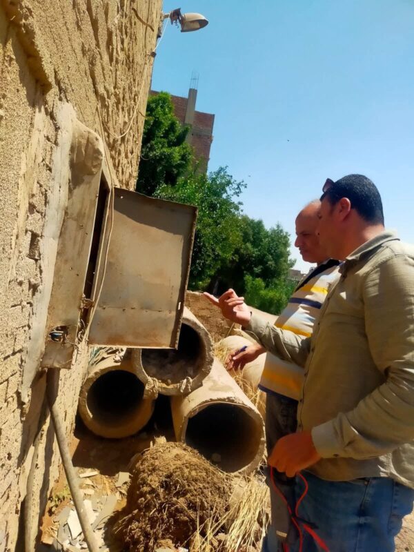 كما تمت المعاينة بطريق المواسير وأفاد مسئولي الكهرباء بأنه سيتم عمل صيانة لعلب الكهرباء الرئيسية بالمنطقة وتغيير بعض الأجزاء التالفة بأخرى جديدة لحل مشكلة إنخفاض الكهرباء.