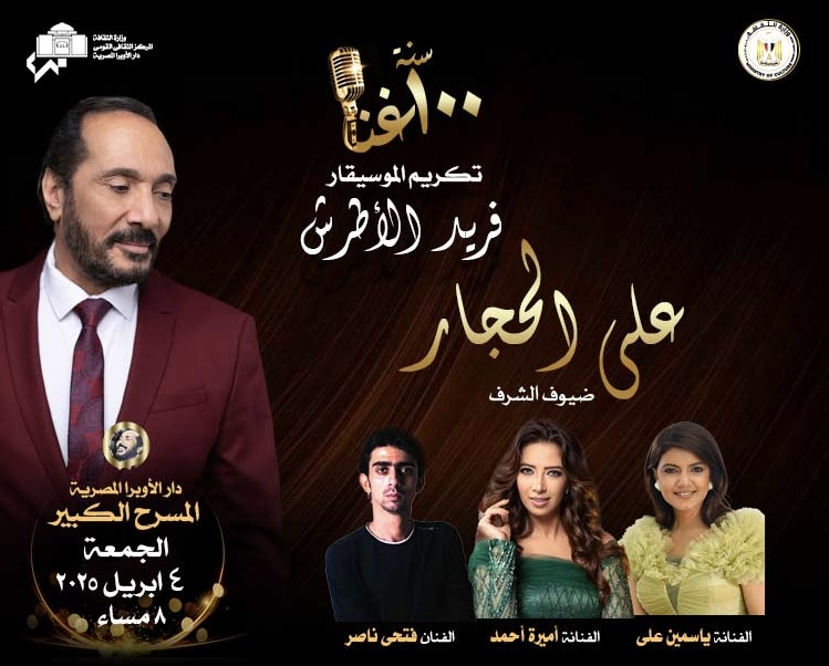 حث النجم الكبير علي الحجار جمهوره على حضور حفله الغنائي المقرر غداً الجمعة الموافق 4 أبريل 2025 بعنوان 100 سنة غنا وذلك احتفاء بالموسيقار الراحل الكبير فريد الأطرش.