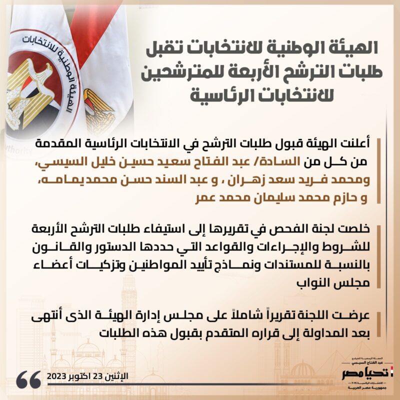 أعلنت الهيئة الوطنية للانتخابات قبول طلبات الترشح في الانتخابات الرئاسية المقدمة من كل من السادة عبد الفتاح سعيد حسين خليل السيسي ، ومحمد فريد سعد زهران ، و عبد السند حسن محمد يمامه ، و حازم محمد سليمان محمد عمر.