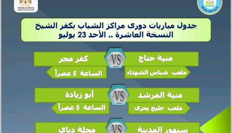 من جانبه أوضح الدكتور عزت محروس، وكيل وزارة الشباب والرياضة بكفر الشيخ، أن الثلاث مباريات تجرى بين فرق المجموعة الأولى، اللقاء الأول بين فريقى” منية جناج و كفر مجر على ملعب مركز شباب شباس الشهداء” و المباراة الثانية بين منية المرشد و أبو زيادة على ملعب خليج بحرى” و المباراة الثالثة بين فريقى سنهور المدينة و محلة دياى على ملعب سنهور المدينة” فى تمام الخامسة عصراً .
