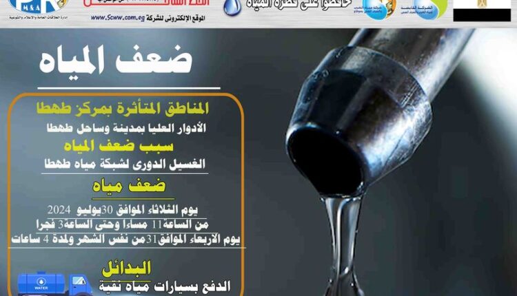 اعلنت شركة مياه الشرب والصرف الصحى بسوهاج عن ضعف المياه بالادوار العليا بمدينة وساحل طهطا اليوم الموافق ٣٠ يوليو ٢٠٢٤ فى تمام الساعة الحادية عشر مساءا وحتى الساعة الثالثة فجر الأربعاء الموافق ٣١ من نفس الشهر ولمدة ٤ ساعات صرح بذلك المهندس محمد صلاح الدين عبد الغفار رئيس مجلس الإدارة والعضو المنتدب واضاف أنه يتم خلال تلك الفترة القيام بأعمال الغسيل الدورى لشبكة مياه طهطا .