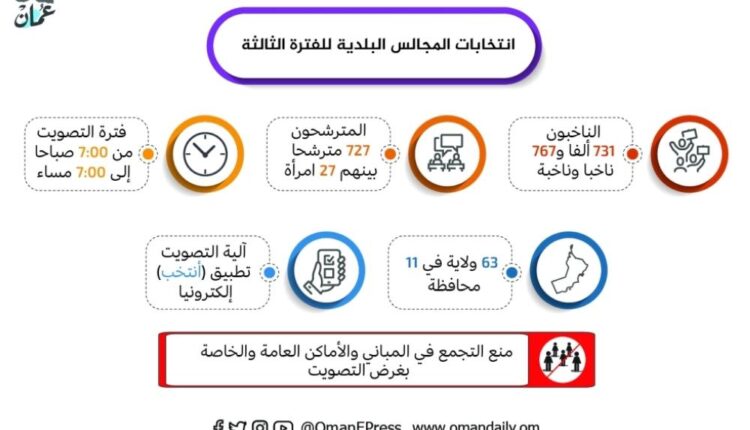 يدلي الناخبون العُمانيون في 63 ولاية بمختلف محافظات سلطنة عمان /اليوم/ الخامس والعشرون من ديسمبر2022، بأصواتهم لاختيار ممثليهم بالمجالس البلدية للفترة الثالثة، وذلك عبر تطبيق (أنتخب)، حيث حددت اللجنة الرئيسية للانتخابات بدء عملية التصويت من الساعة السابعة صباحًا إلى السابعة مساء، حسب توقيت سلطنة عمان مع مراعاة فارق التوقيت لكل محافظة، وستعلن النتائج مباشرة بعد الفرز ، حيث ستبدأ عملية الفرز الآلي فور انتهاء عملية التصويت.