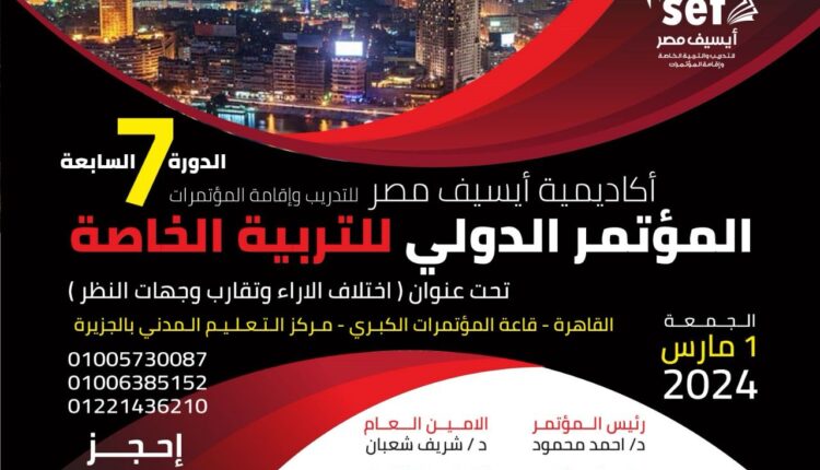 يعقد المؤتمر الدولي للتربية الخاصة ( الدوره السابعه ) في قاعة المؤتمرات الكبرى بمركز التدريب المدني أمام برج القاهرة يوم الجمعة الموافق 1 مارس 2024 تحت عنوان إختلاف الآراء وتقارب وجهات النظر.