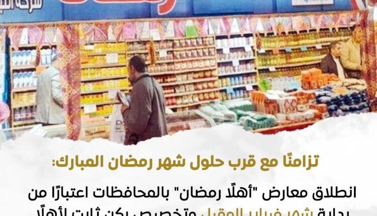 أعلنت وزارة التموين والتجارة الداخلية انطلاق معارض “أهلًا رمضان” بالمحافظات اعتبارًا من بداية شهر فبراير المقبل وتخصيص ركن ثابت لاْهلًا رمضان بأسواق اليوم الواحد والسلاسل التجارية والمجمعات الاستهلاكية.