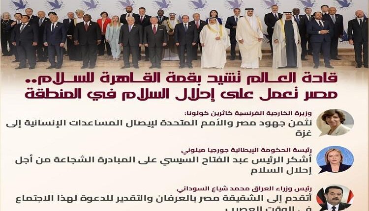 أكد بيان للحملة الرسمية للمرشح الرئاسي عبد الفتاح السيسي أن مصر تعمل على إحلال السلام في المنطقة، وأن قادة العالم أشادوا بقمة القاهرة للسلام اليوم السبت .
