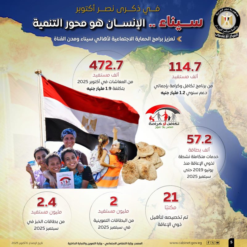 وفيما يتعلق بتعزيز برامج الحماية الاجتماعية لأهالي سيناء ومدن القناة، استفاد 114.7 ألف مستفيد من برنامج “تكافل وكرامة”، بإجمالي دعم سنوي 1.2 مليار جنيه، كما بلغ عدد المستفيدين من المعاشات 472.7 ألف مستفيد في أكتوبر 2025، بتكلفة 1.9 مليار جنيه، إلى جانب إصدار 57.2 ألف بطاقة خدمات متكاملة نشطة لذوي الإعاقة منذ يونيو 2019 حتى سبتمبر 2025.