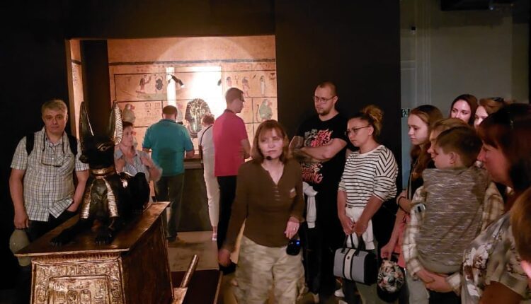 استقبلت المرشدة السياحية الروسية ايرينا التي أجادت شرح تاريخ مصر الحضور لتبدأ رحلة الشرح لعدد 100 قطعة، وهي نسخ طبق الاصل للمقتنيات المعروضة في المتحف المصري بالقاهرة، صنعها مجموعة من الخبراء الروس في علم المصريات، حيث تم وضع تمثال لعالم الاثار البريطاني “هوارد كارتر” مكتشف المقبرة، ورجل الاعمال البريطاني اللورد “كارنافون”.