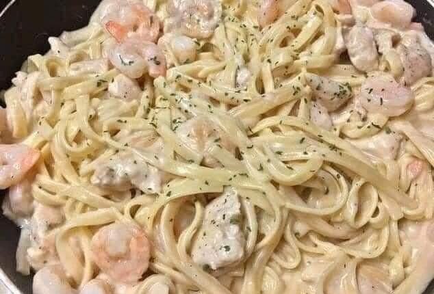 لتحضير الجمبري القولون في مقلاة بالزبدة وملح حتى يتغير لونها ثم أضفها إلى المعكرونة. قدمي على الفور التزيين بجبن البارميزان ورقائق البقدونس.
