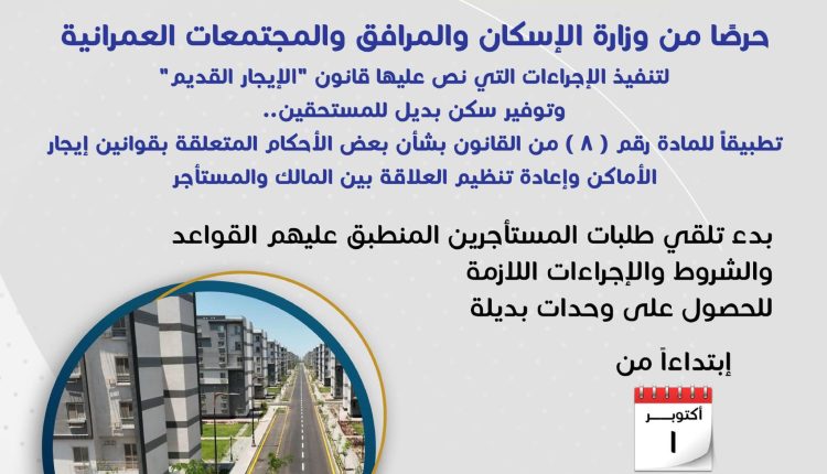 بالإنفوجراف: “الإسكان” توضح كيفية تلقي طلبات المستأجرين المنطبق عليهم قانون “الإيجار القديم” للحصول على وحدات بديلة في أول أكتوبر ٢٠٢٥