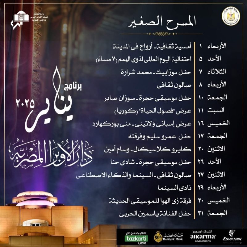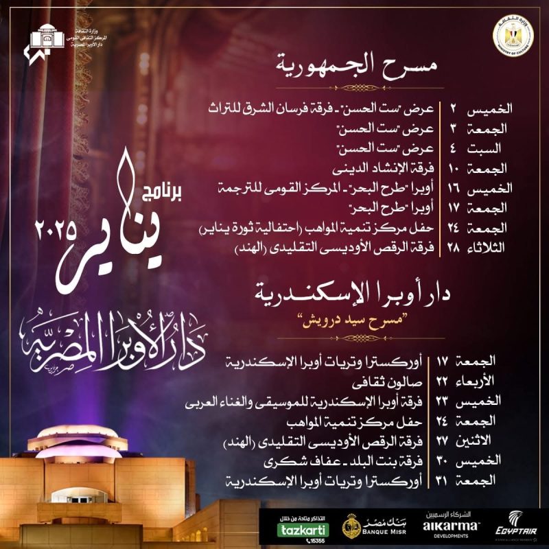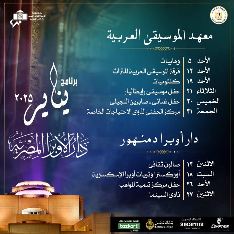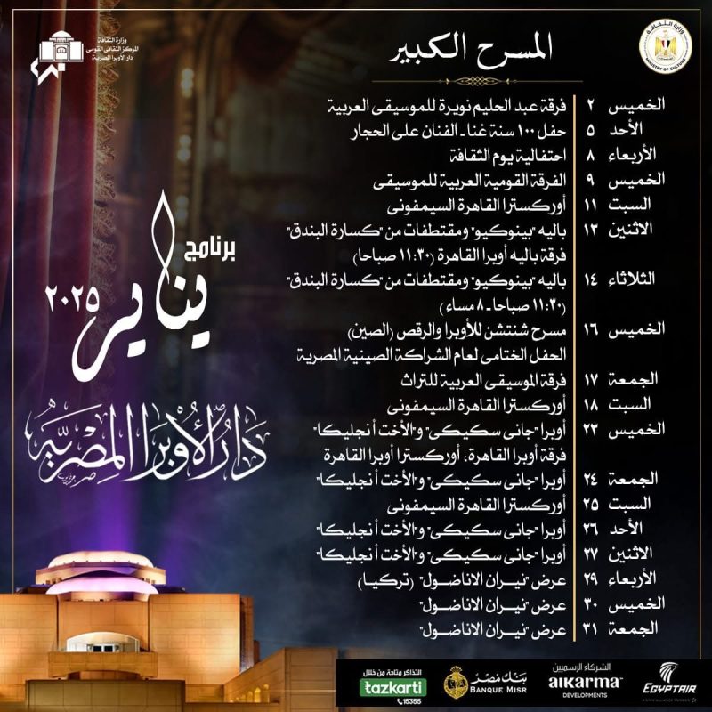 أعدت دار الأوبرا المصرية، برئاسة الدكتورة لمياء زايد برنامج ثري ومتنوع بشهر يناير المقبل من عام 2025 على أغلب مسارح دار الأوبرا المصرية.