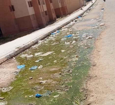 بالصور..تلوث ورائحة كريهة بسبب انتشار مياه الصرف الصحي بشوارع مساكن الجيش ببرج العرب الجديدة
