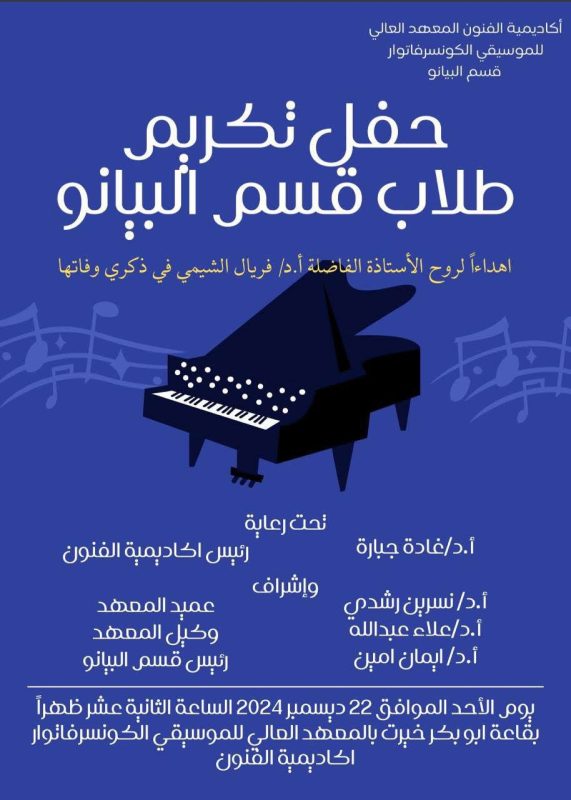 شهدت الدكتورة غادة جبارة رئيس أكاديمية الفنون اليوم حفل تكريم طلاب قسم البيانو والذى أقيم بقاعة أبو بكر خيرت تحت إشراف فنى للأستاذ الدكتور ايمان امين رئيس قسم البيانو بالمعهد وإشراف كلا من الاستاذ الدكتور نسرين عميد المعهد العالى لموسيقى الكونسيرفاتوار والاستاذ الدكتور علاء عبد الله وكيل المعهد.