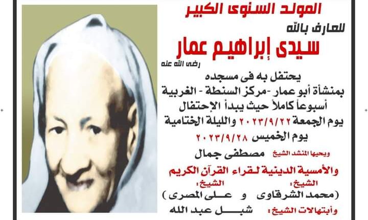 أعلنت مشيخة بيت عمار الشناوية الاحمدية بقيادة الشبخ شرف عمار أن بداية الاحتفال بمولد العارف بالله سيدي ابراهيم عمار بمنشأة عمار بمركز السنطة هو يوم الجمعه الموافق 9/22 وان الاحتفال بالليلة الختامية بمولدة ستكون مساء يوم الخميس الموافق 9/28 ويحضر الاحتفال القيادات الشعبيه والتنفيذية بالمحافظه