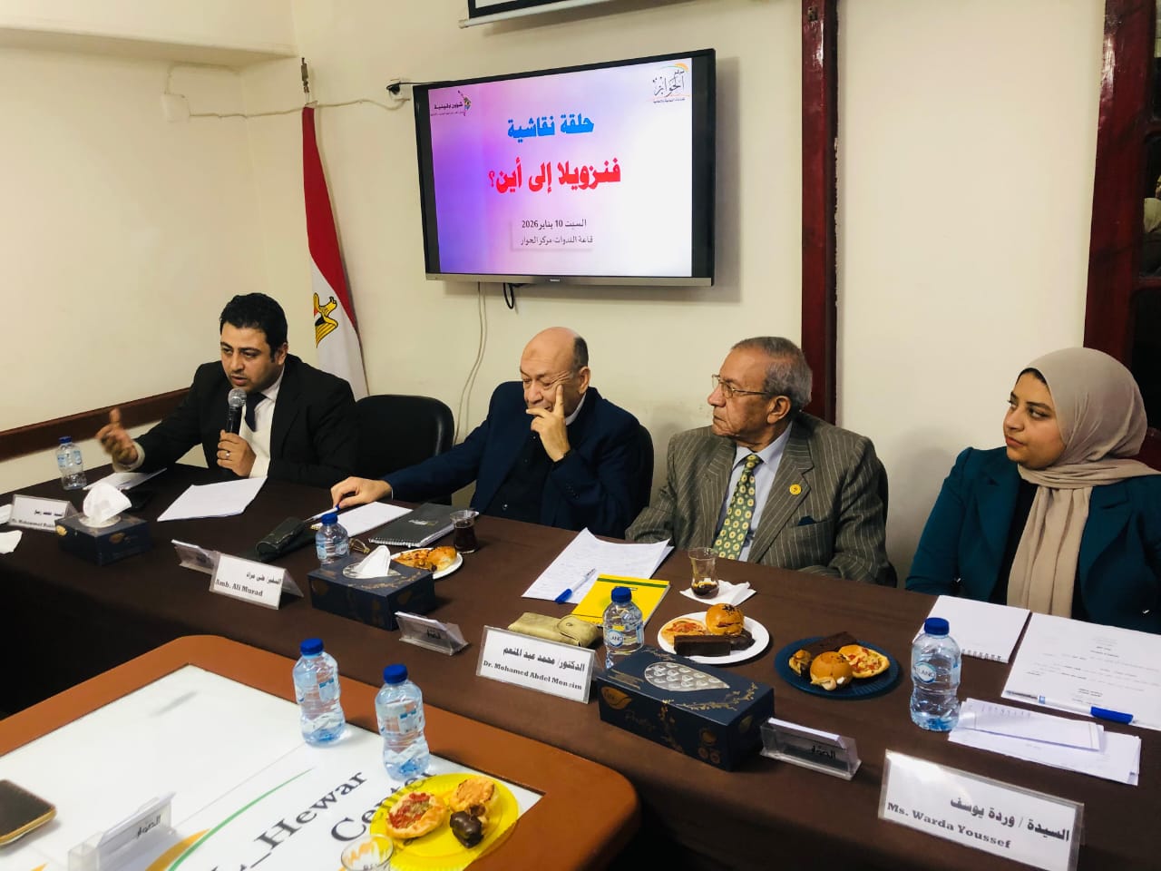 وعقب على ورقة العمل الرئيسة السفير/علي مراد -سفير مصر الأسبق لدى فنزويلا البوليفارية-، حيث قدم قراءة معمقة لطبيعة المشهد السياسي الفنزويلي، وانعكاسات الازمة على استقرار الدولة ومؤسساتها.