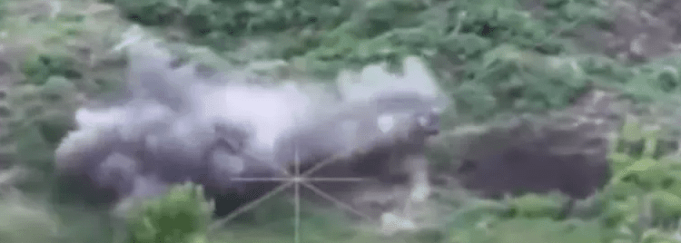 وظهر الجندي الذي كان يرتدي اللباس العسكري وهو يركض للاختباء في الأشجار القريبة من مكان الانفجار وسط دخان أبيض كثيف.