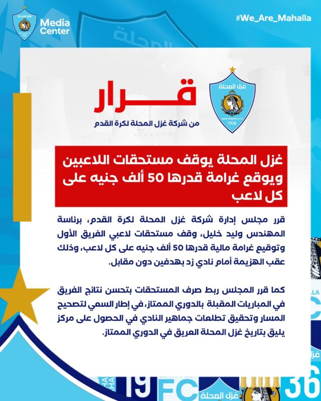 كما قرر المجلس ربط صرف المستحقات بتحسن نتائج الفريق في المباريات المقبلة بالدوري الممتاز، في إطار السعي لتصحيح المسار وتحقيق تطلعات جماهير النادي في الحصول على مركز يليق بتاريخ غزل المحلة العريق في الدوري الممتاز.
