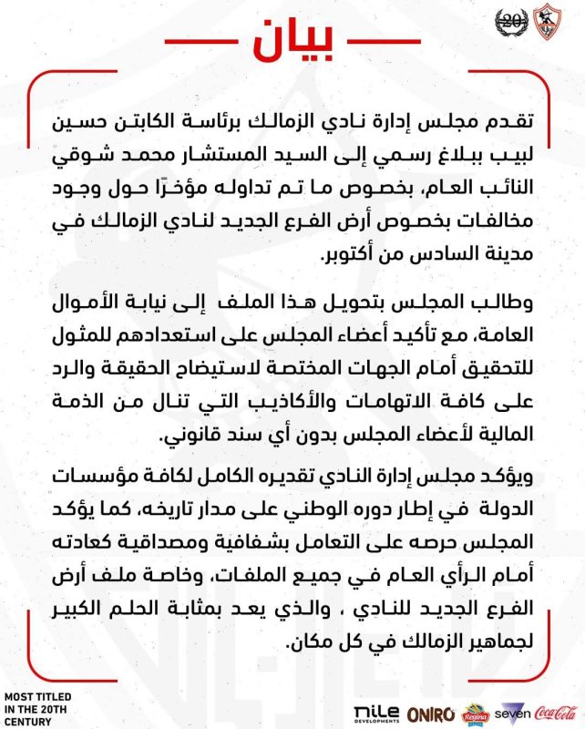 توجه مجلس إدارة نادي الزمالك برئاسة حسين لبيب ببلاغ رسمى إلى السيد المستشار محمد شوقي النائب العام، بشأن ما تم تداوله مؤخرًا حول وجود مخالفات بخصوص أرض الفرع الجديد لنادى الزمالك فى مدينة السادس من أكتوبر.