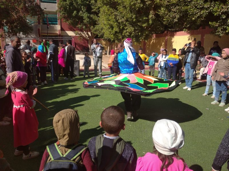 بين طلاب وطالبات المدرسة ثم قام فريق السيرك بتقديم فقرات متنوعة أسعدت التلاميذ