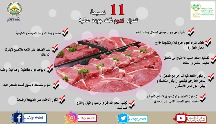 نشر مركز المعلومات الصوتية والمرئية بوزارة الزراعة واستصلاح الأراضي ، والمكتب الاعلامي للوزارة، فيديو وانفوجراف، استعرض خلاله ١١ نصيحة يجب مراعاتها لشراء لحوم ذات جودة عالية بمناسبة قرب حلول عيد الأضحى المبارك.