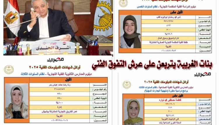 في إنجاز تعليمي جديد يُضاف إلى سجل محافظة الغربية الحافل بالتميز، تربعت ثلاث طالبات من أبناء المحافظة على عرش التفوق في امتحانات الدبلومات الفنية لعام 2025، محققات المركز الأول على مستوى الجمهورية في تخصصاتهن.
