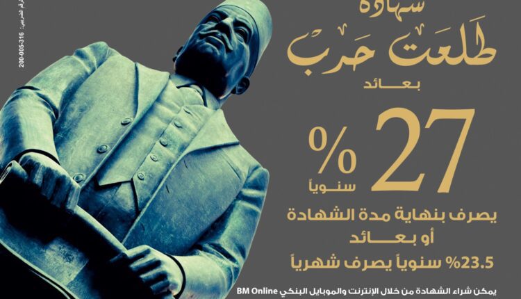 قرر بنك مصر إعادة اصدار الوعاء الادخاري الجديد شهادة “طلعت حرب”; وهي شهادة ادخار مدتها سنة تتمتع بمعدل عائد ثابت طوال مدة الاحتفاظ بالشهادة وتبلغ نسبة العائد للشهادة 27% سنويًا تصرف بنهاية مدة الشهادة، هذا ومن الممكن أن يصرف العائد شهريًا بعائد %23.5 سنويًا، وتبدأ فئات الشهادة من 1000 جنيه ومضاعفاتها وتصدر للأفراد الطبيعيين أو القصر من المصريين أو الأجانب، ويتم احتساب المدة اعتبارًا من يوم العمل التالي للشراء.