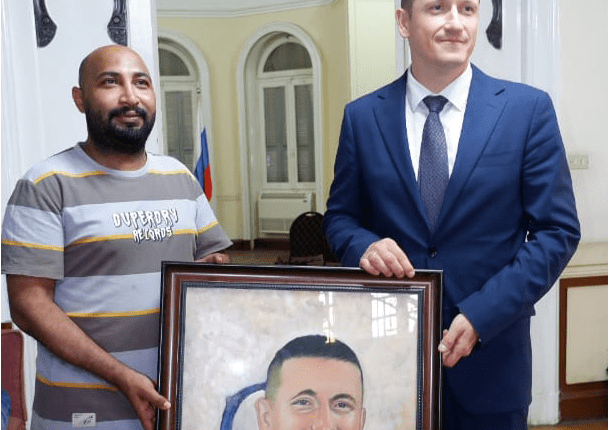 وقبل بداية إحتفالية عيد النصر فاجأ الفنان مصطفى غنيم السفير الروسي جيورجي بوريسينكو بعمل بورترية له بمناسبة عيد النصر ,
