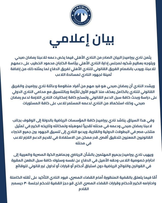 وأشار بيراميدز في بيانه إلى ترحيبه بانضمام الفريق القانوني للنادي الأهلي إلى هيئة الدفاع عن اللاعب، معتبرًا ذلك إضافة مهمة تعزز الجهود القانونية المبذولة لدعم رمضان صبحي في أزمته الحالية.
