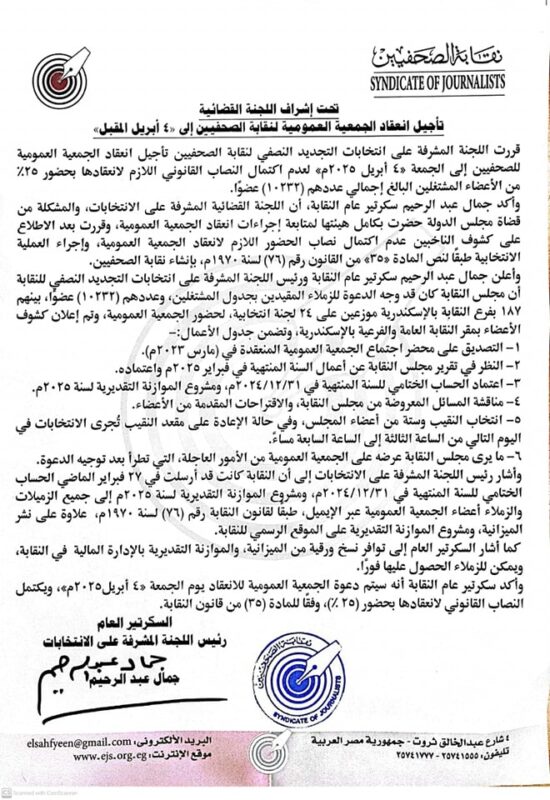 قررت اللجنة المشرفة على انتخابات التجديد النصفي لنقابة الصحفيين تأجيل انعقاد الجمعية العمومية للصحفيين إلى الجمعة «4 أبريل 2025م» لعدم اكتمال النصاب القانوني اللازم لانعقادها بحضور 25%من الأعضاء المشتغلين البالغ إجمالي عددهم (10232) عضوًا.