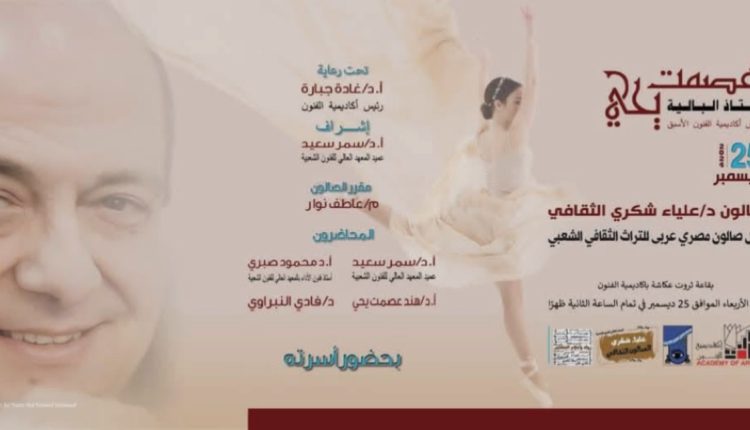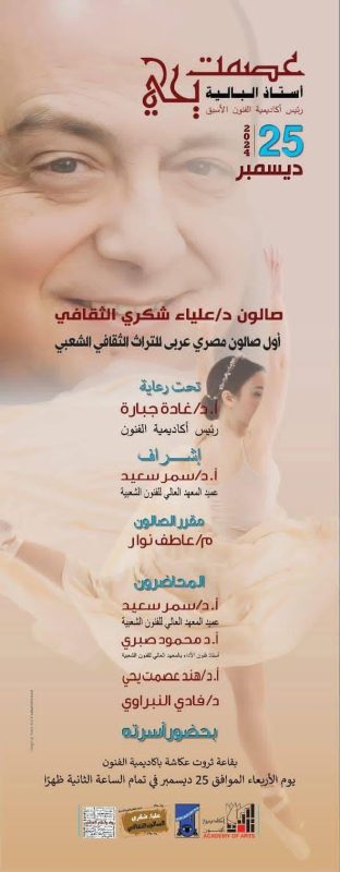 ينظم المعهد العالى للفنون الشعبية برعاية الدكتورة غادة جبارة رئيس أكاديمية الفنون وإشراف الاستاذ الدكتور سمر سعيد عميد المعهد العالى للفنون الشعبيه صالون الدكتورة علياء شكرى الثقافى وشخصية الصالون لهذا الشهر هو الراحل الأستاذ الدكتور عصمت يحيى .