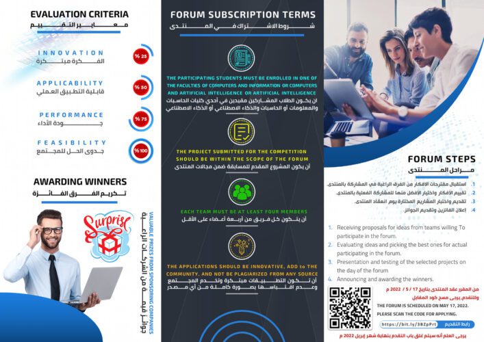 تنظم كلية الحاسبات والمعلومات بالتعاون مع كلية الذكاء الاصطناعي بجامعة كفر الشيخ منتدى الحوسبة والذكاء الاصطناعي، على مستوى الجامعات المصرية، وذلك بكلية الحاسبات والمعلومات بالجامعة، يوم الثلاثاء الموافق 17 مايو الحالي، وذلك تحت رعاية الدكتور خالد عبدالغفار وزير التعليم العالي والبحث العلمي، و الدكتور عبدالرازق دسوقي، رئيس جامعة كفرالشيخ، والدكتور رضا صالح، نائب رئيس الجامعة لشئون خدمة المجتمع وتنمية البيئة، وتنمية المجتمع بإشراف الدكتور محمد عبدالعال، نائب رئيس الجامعة لشئون التعليم والطلاب الدكتور أسامة أبوسعدة، عميد كلية الحاسبات والمعلومات.